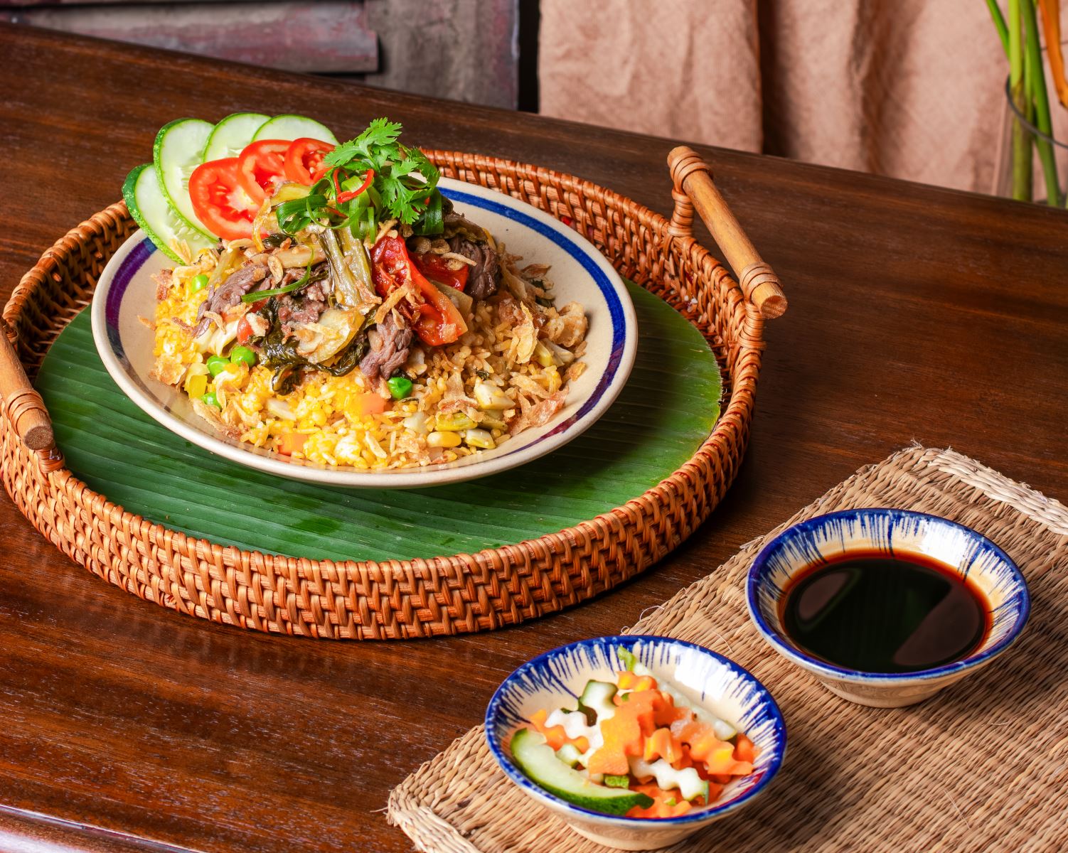Cơm chiên dưa bò là món ăn với hương vị đậm đà và màu sắc bắt mắt. Dưa muối được chiên cùng thịt bò, cơm, trứng, hành tây và các loại gia vị. Món ăn có vị chua nhẹ từ dưa, vị ngọt từ miếng thịt bò mọng nước, kết hợp cơm chiên được nêm nếm tròn vị, tạo nên một bữa tiệc vị giác hoàn hảo.